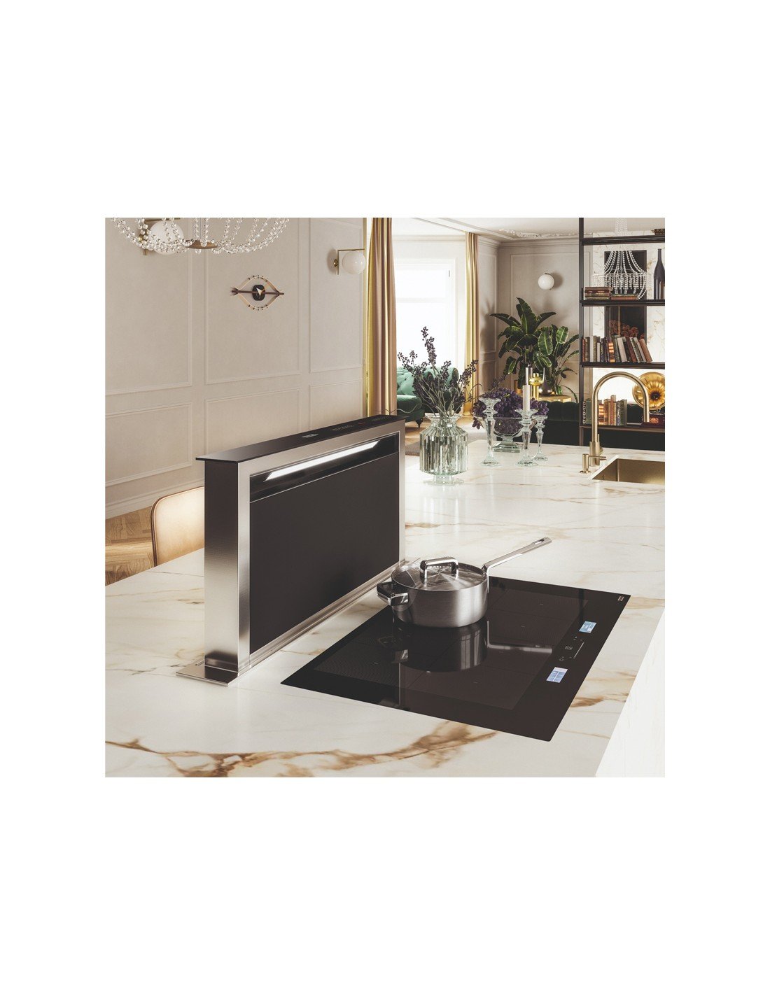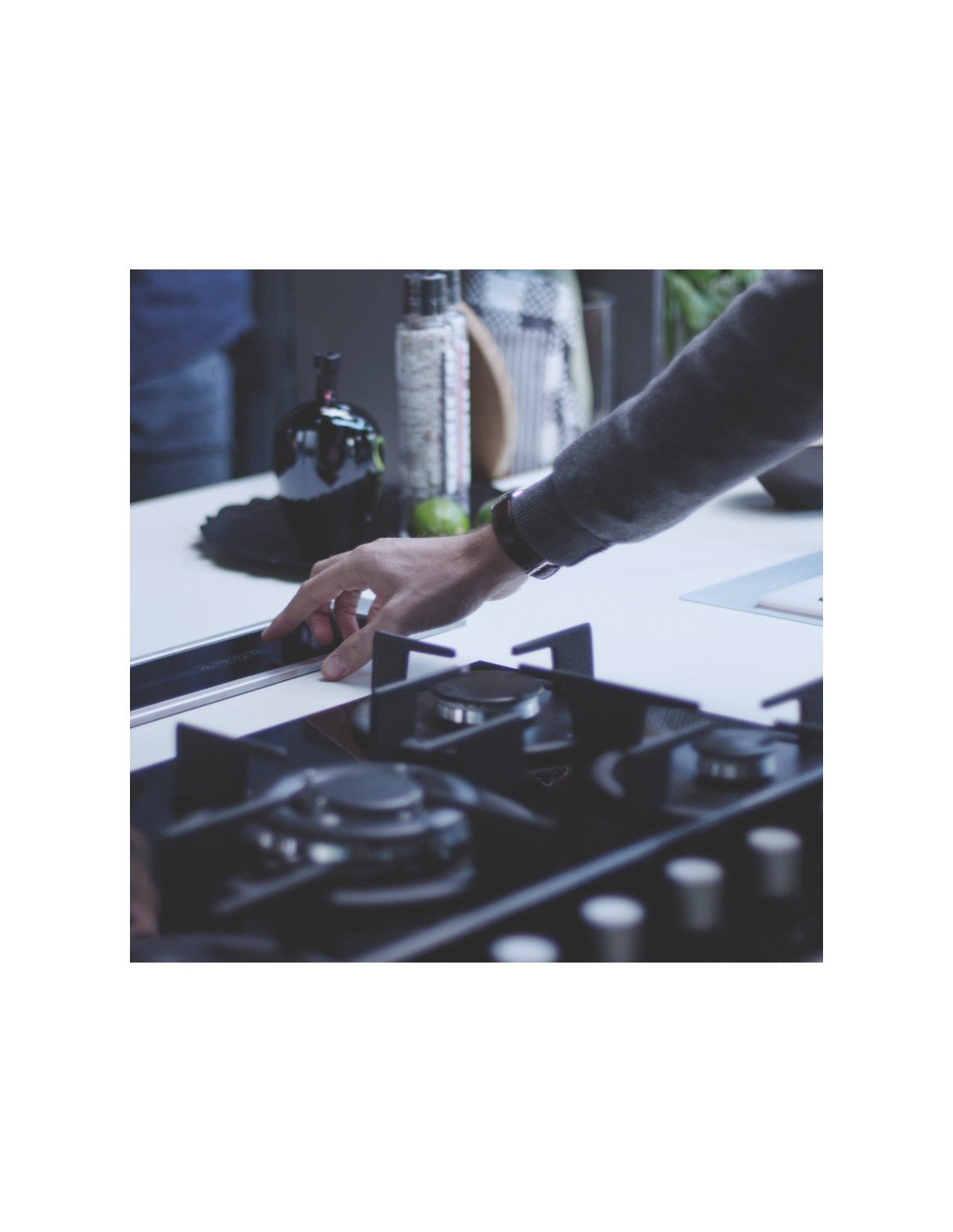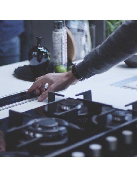 | Campana integrada a cubierta de mueble, cristal negro y borde acero inox, aspiración perimetral, 4 velocidades + intensivo, capacidad máx. de extracción 670 m3/h, 69 dB máx., clase energética B. Dimensiones: 80 x 12 cms. Opera con panel de control digital y control remoto opcional. La campana Downdraft integrada a cubierta, emerge de la mesada cada vez que necesite ser utilizada, es ideal para islas y espacios donde la visibilidad, estética y funcionalidad tienen gran valor. Puede funcionar recirculante * o con salida al exterior. Posee una función filtrante que indica saturación de filtros. Diseñado bajo estándares exigentes en vanguardia y tecnología, fabricado en CE. |