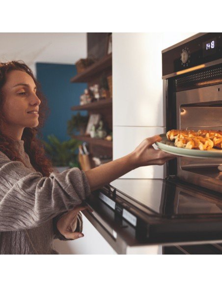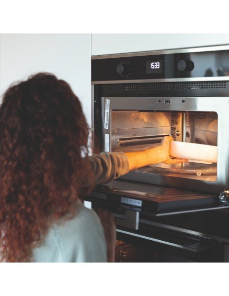 Horno microondas combinado con grill, cristal negro y acero inox, opera con mando push pull y control electrónico digital, clase energética A, 5 recetas automáticas, 7 funciones especiales, base 60. Dimensiones: 59 x 45 x 56 cms., capacidad 40 litros, Incluye 1 bandeja cristal, 1 bandeja horno y alzador para grill. Diseñado bajo estándares exigentes en vanguardia y tecnología, fabricado en CE.
